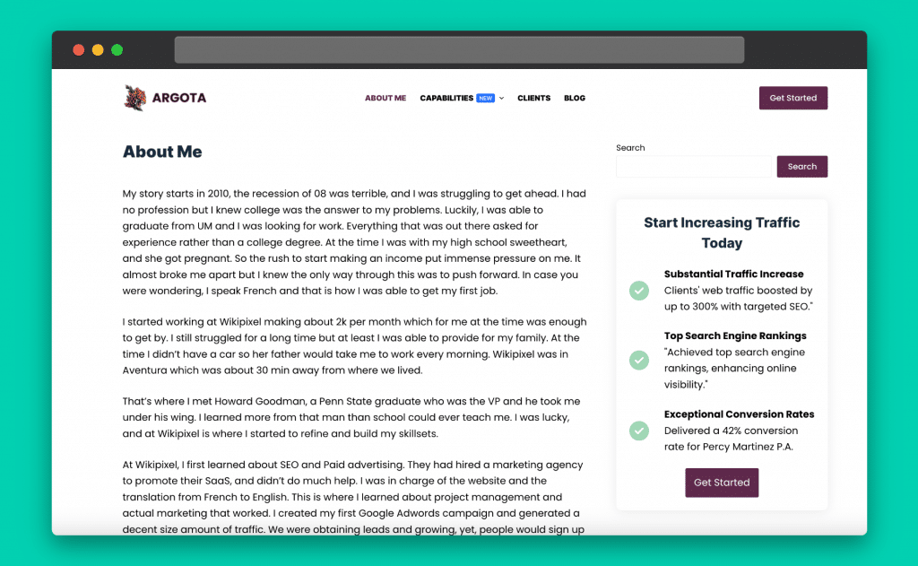 He’s a digital marketing specialist, and he shares intimate details of his life and what called him to start his business on his “About Me” page. This allows him to make a real connection with his audience. And because the story is uniquely his and shapes his values, he can easily tailor his content to represent what he stands for.