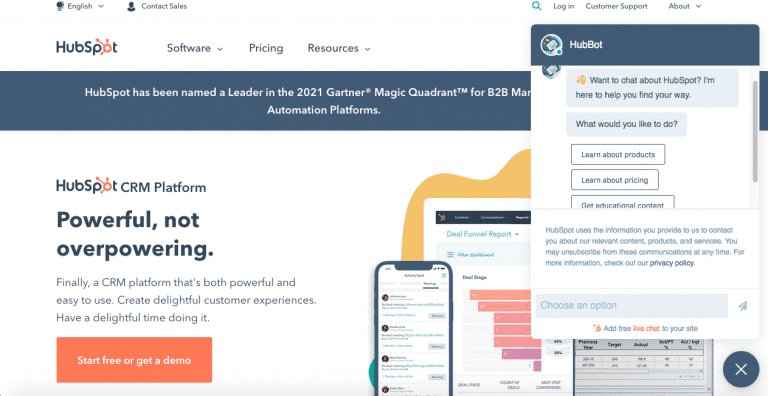 A great example of a B2B chatbot used to navigate a specific website’s content is HubSpot, a leading marketing, sales automation, and customer services company. When you open their webpage, visitors can immediately find the chatbot in the right-hand corner: