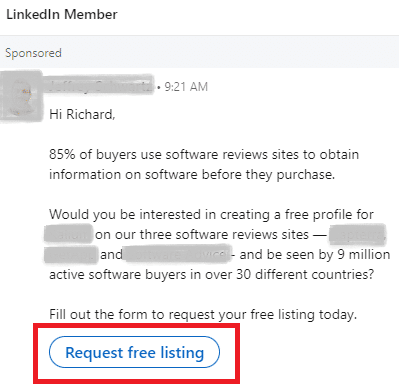 The message is a soft sell. It’s obvious that the person is pitching, but the ask is low-pressure. Most people have 15 minutes to spare, especially if there’s a chance to learn how to increase sales by one-fifth.