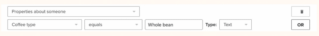 When you choose the “Properties about someone” option, any data stored in the “Custom Properties” section of a contact’s profile can be used to build segments. Let’s say you have data on the product preferences of your newsletter subscribers. Then, create a segment based on their responses.