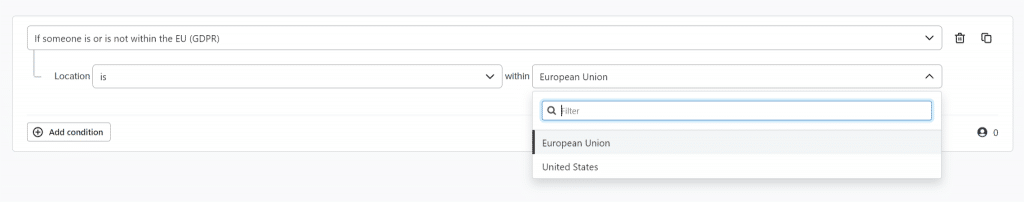 Use this condition when you want to exclude people in the EU from a segment to follow GDPR rules.