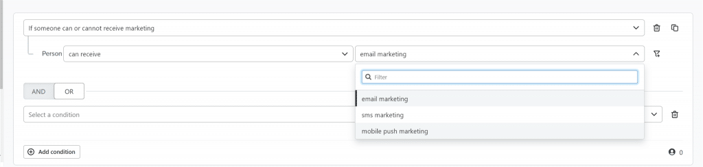 To find out, add a condition using the “AND” connector: Check if the person can receive marketing > can receive > email marketing (or SMS or push notifications).