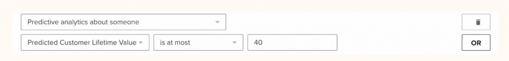 Let’s say your average customer spends around $15. But some customers are predicted to spend less. You can create a segment of customers expected to spend no more than $5. Then, target them with a discount offer to encourage their next purchase—like a win-back or re-engagement campaign.