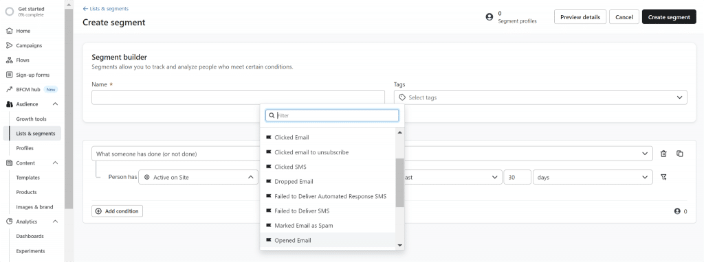 - A Segment builder will appear with the fields such as Name, Tags, and Select a condition.