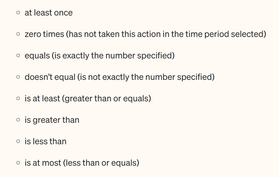After selecting the activity, the next step is to segment based on how often (or not often) the activity is done. Let’s say, at least once. The allowed operators in this category are as follows: