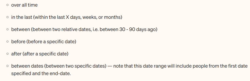 Once you have finalized the frequency of activity, you also need to choose a timeframe to count the number of events for each person. Let’s say, overall time. The other available options for timeframe are: