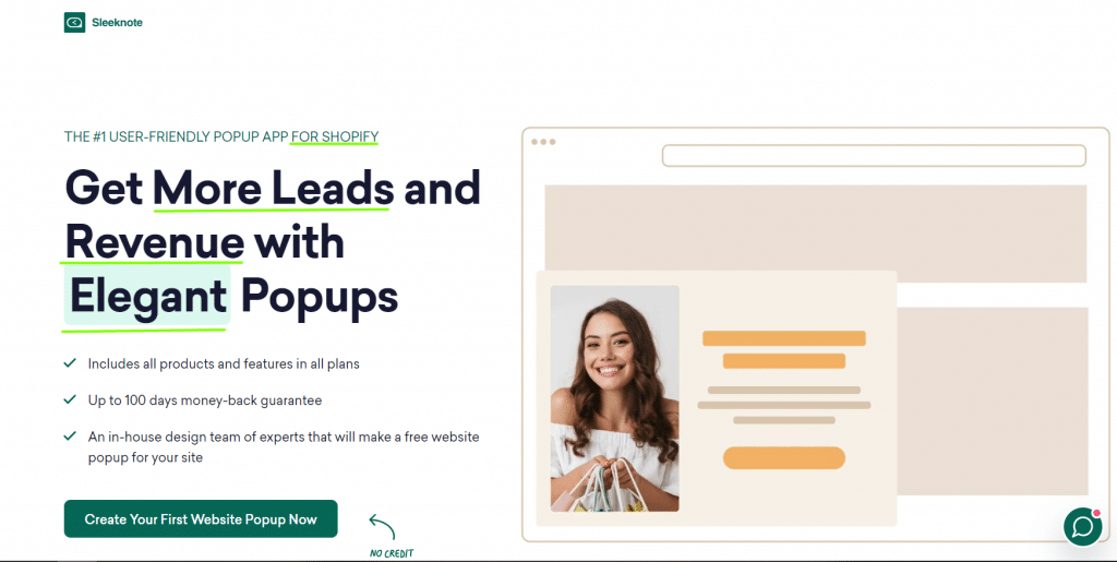 Sleeknote’s dynamic landing page modifies the headline based on the visitor’s search query. For example, if you enter “Website Pop-Up” and “Shopify Pop-Up,” the copy changes.
