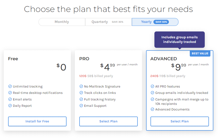 Mailtrack is highly affordable and its most expensive plan is only $9.99 per month (or $119 billed annually).