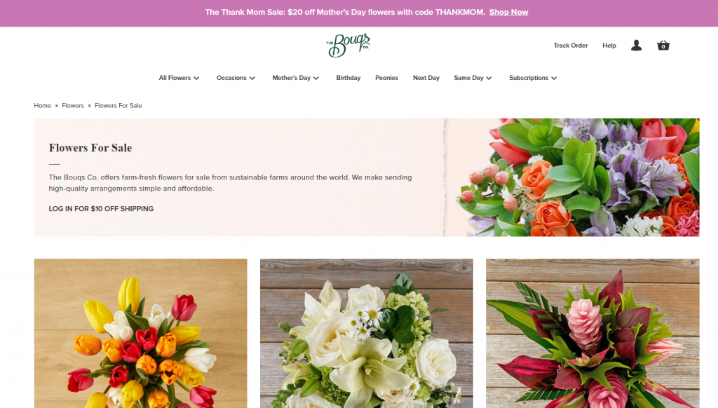 Bouqs, an eCommerce flower company, uses website personalization effectively. Their site is set up to capture customers searching for hyper-specific keywords like “flowers for sale,” where they’ll then land on a personalized page: