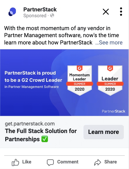 Here’s a good example of a Facebook paid ad by PartnerStack. By integrating awards from G2 into their design, they quickly showcase their credibility as a brand to attract new clients: