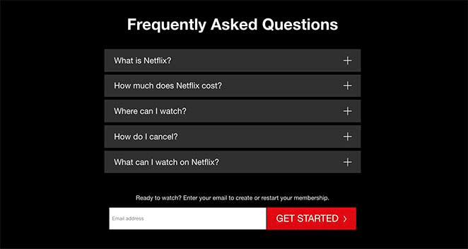 This FAQ section is designed to reduce friction in the sales funnel by addressing common concerns people looking to sign up for their streaming service may have. By simply clicking on the question they need answering, users are met with a concise answer.
