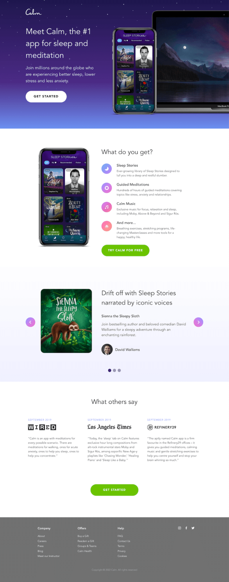 Let’s refer back to Calm here. Their landing page is simple, with clean and straightforward copy under the headline “Meet Calm,” which instills a feeling of harmony and peace.
