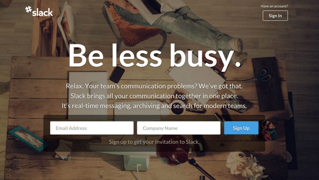 Slack is a group communication software. This USP clearly communicates what sets Slack apart and directly speaks to the user’s needs and desires. Their need is to be less busy by having a way to streamline communication and get their work done.