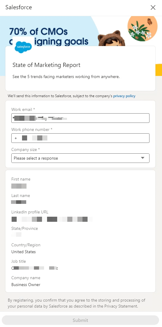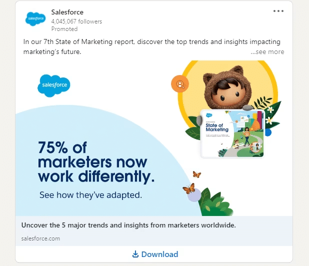 Below is an example of a lead generation form advert from Salesforce on LinkedIn. it gets users to download a lead magnet in the form of a report in exchange for their contact information: