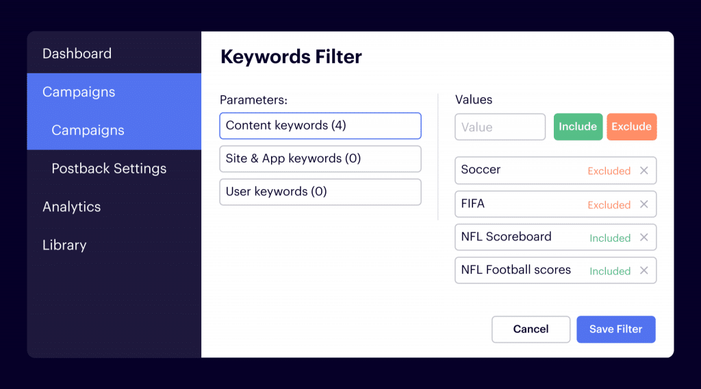 For instance, if you wish to target impressions on pages displaying National Football League scores, you can utilize the Keywords Filter feature during your campaign setup.